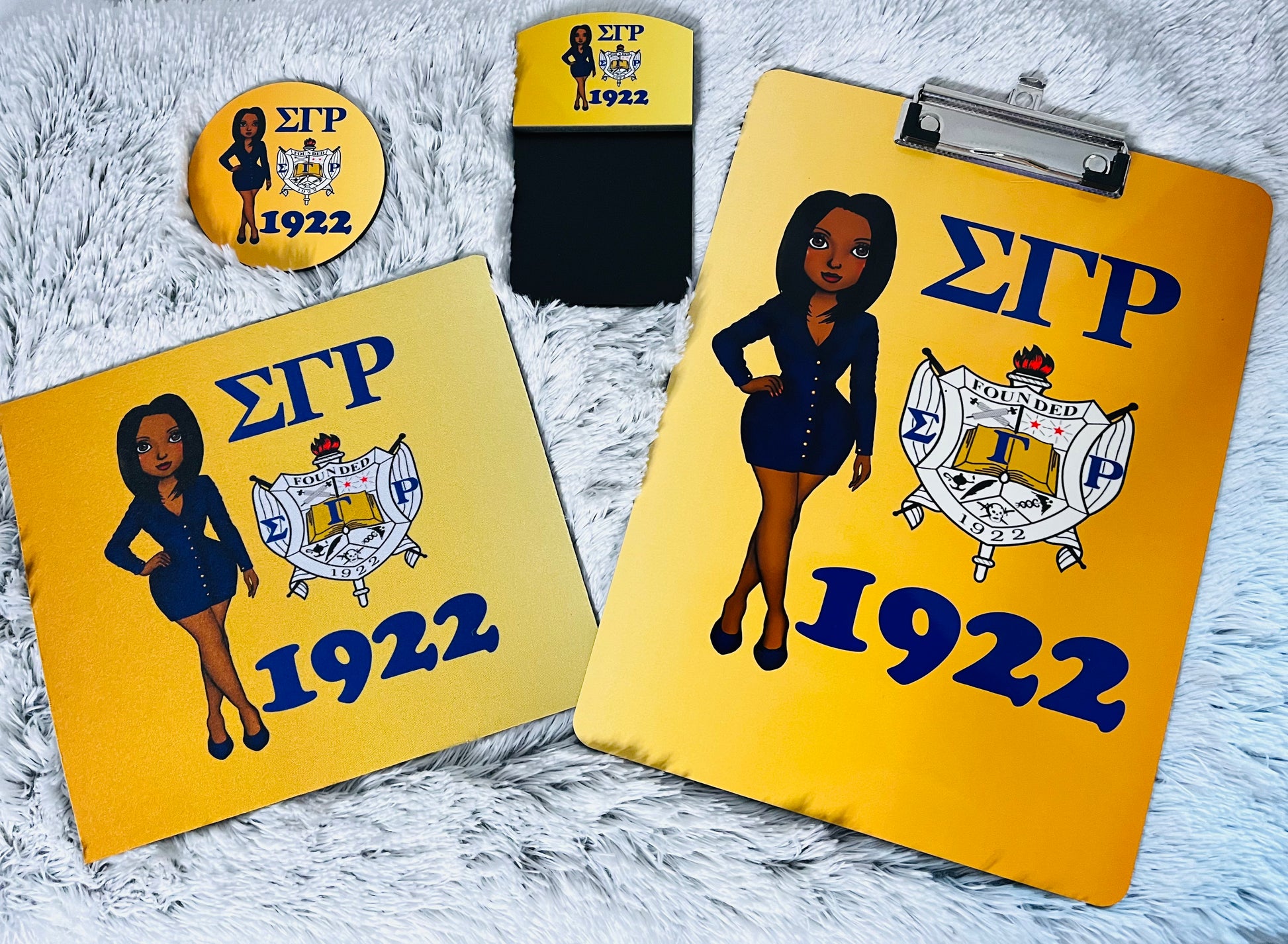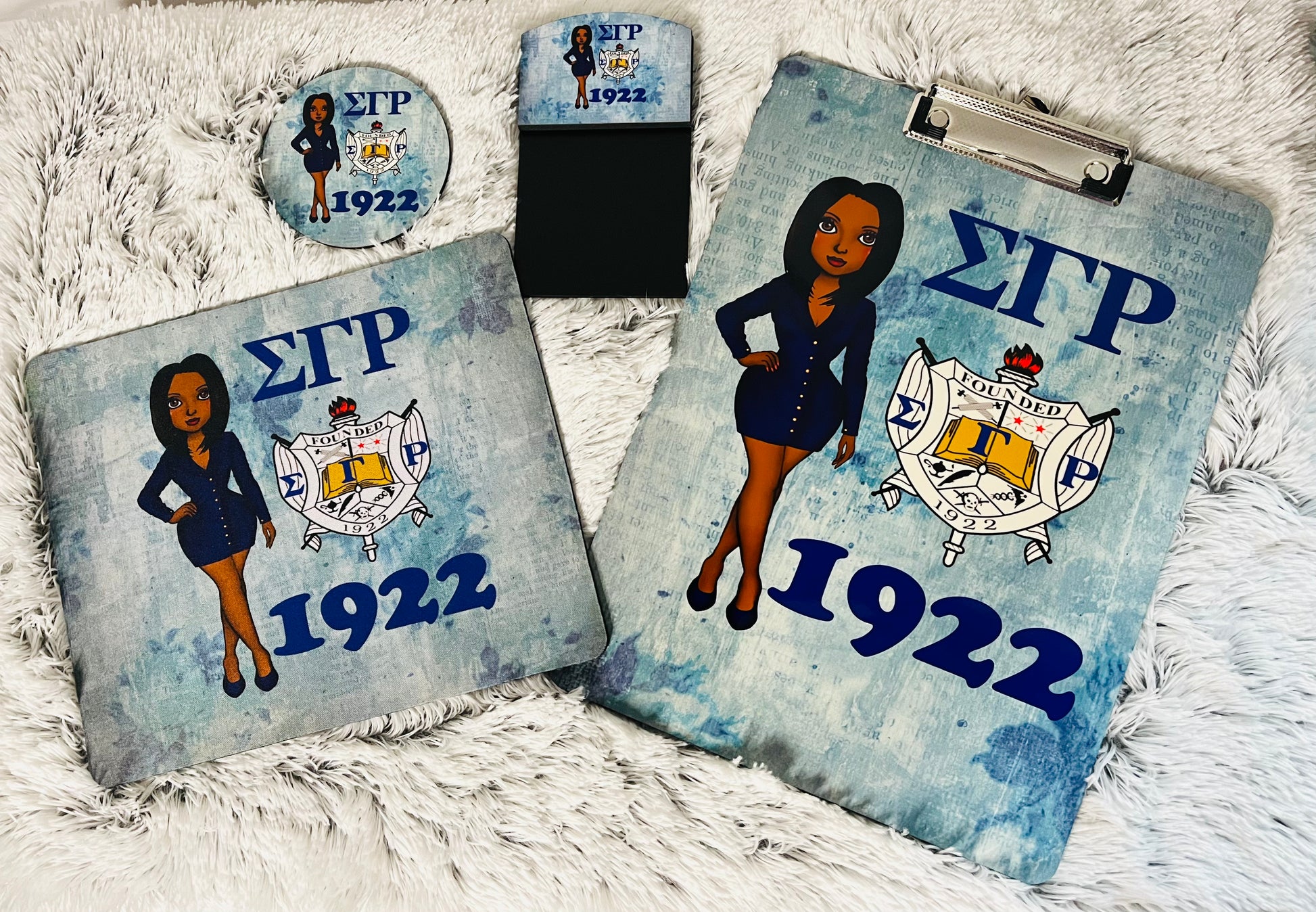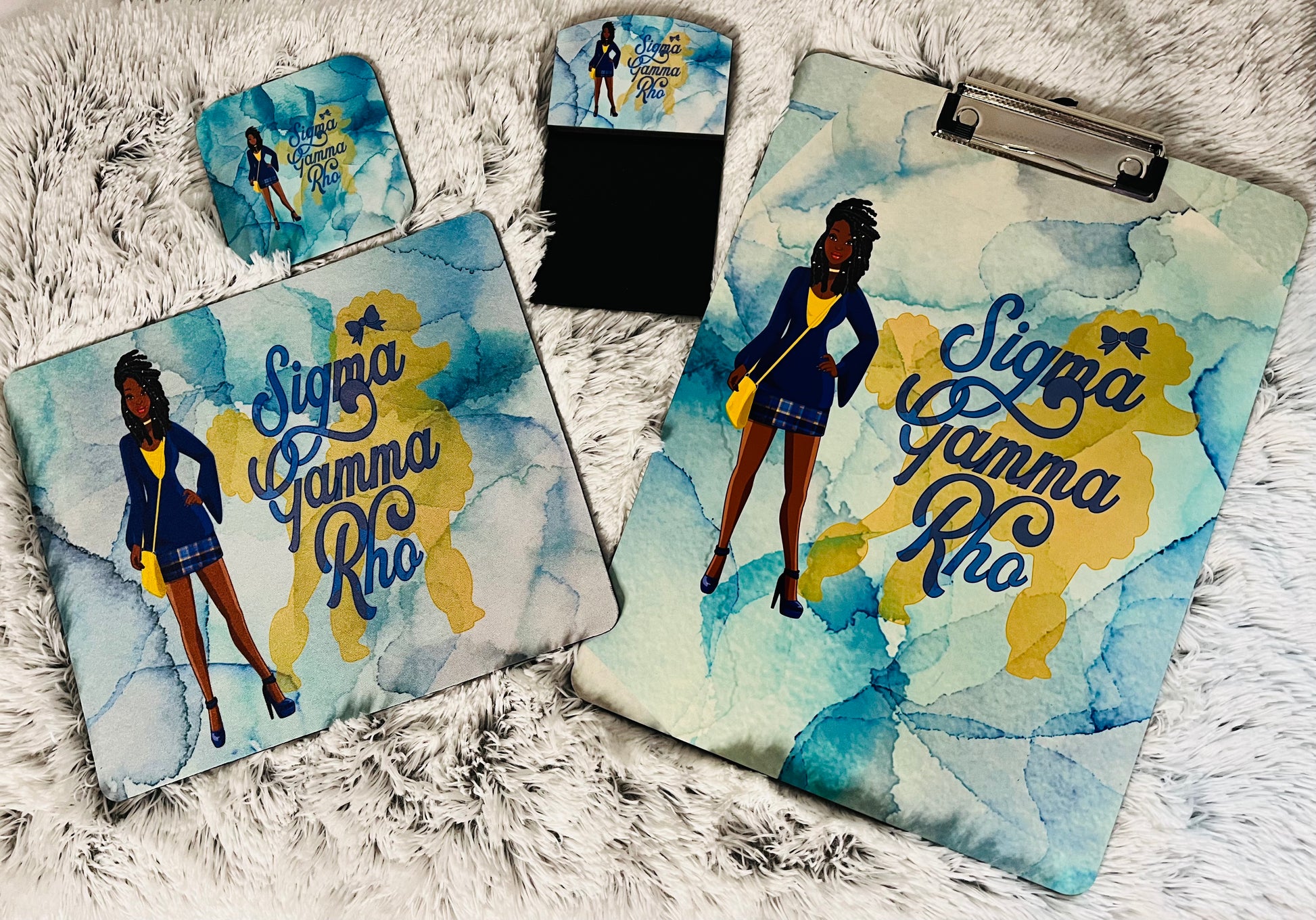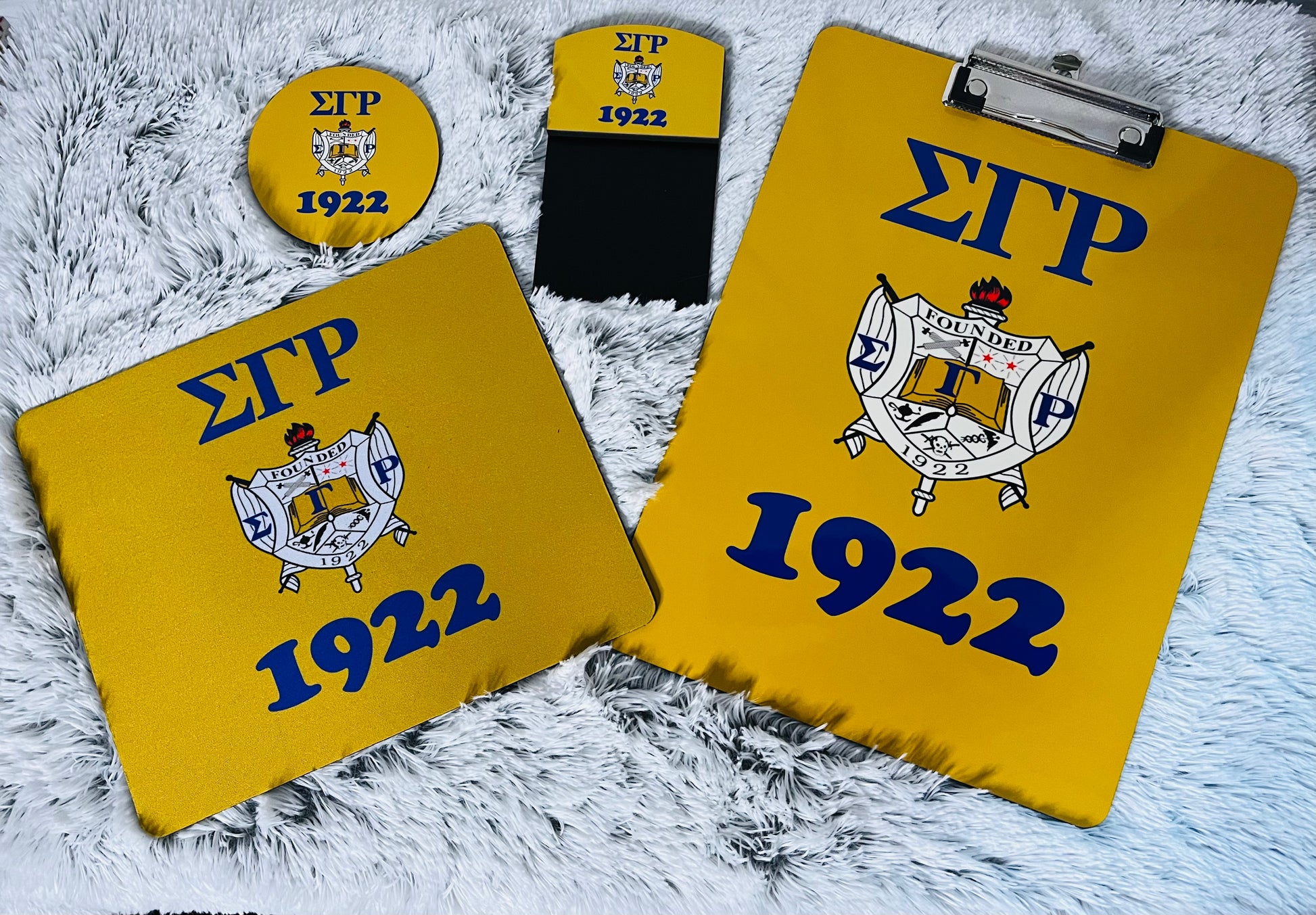 Office accessories representing SGHRO in various design and styles and designs. Set may include clipboard, mouse pad, coaster, sticky note holder, journal. Sets vary, may include different items in each design set.